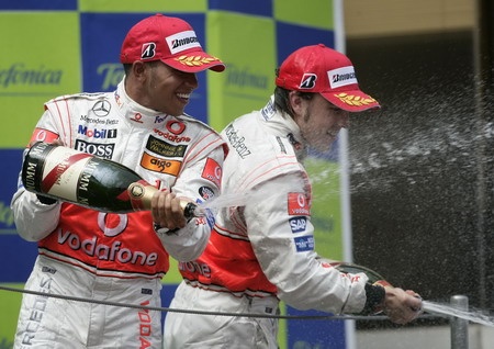 Hamilton場場上頒獎台![]() ▲除了膚色Hamilton優異的表現更讓隊友Alonso感到壓力這樣優異的表現讓同是隊友又是兩屆世界冠軍的Fernando Alonso的光環消退不少,Alonso雖對外表示不再乎Hamilton所帶來的壓力,強調自己最大的競爭對手仍是法拉利。不過從西班牙站Alonso一起跑就罕見的衝出場外,心理多少受到影響。