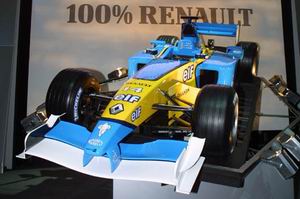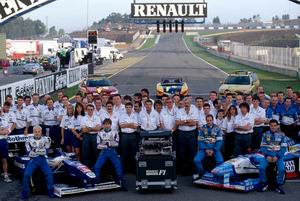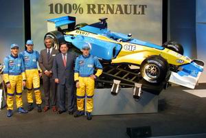 ▲百分百的RENAULT,滿懷百分百的期許,三年後他們希望能夠把世界冠軍獎盃帶回家RENAULT的的主席暨首席執行長Louis Schweitzer在該車廠的技術中心替新車展開揭幕儀式,他在談話中揭示了RENAULT之所以耗費鉅資再度投入這項活動的目的,就是要在全世界打響車廠品牌的知名度,這點可以從車身上的企業代表色系看出來。至於車隊對於今年參賽的目標,則是直接鎖定進入前四強!車隊首席執行長Patrick Faure並補充,明年他們就能夠經常贏得單站冠軍,到了2004年就可以開始問鼎世界冠軍!