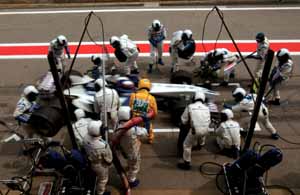 ![]() ▲Montoya在進行第二次PIT-STOP之後,在打算離開時曾因首席技師的疏忽發生一陣混亂隨著比賽進行,M.Schmacher的領先趨勢越來越明顯,R.Schumacher此時在彎道上一個轉向不足讓他衝上草地,隊友Montoya立刻將他超掉,R.Schumacher也馬上回維修區換上新鼻翼,速度大不如前,幾圈後再度回去更換一次,排位因而大幅掉到第13位。結果Montoya便以第二位的姿態追擊領先他28秒的M.Schumacher,第四位的Coulthard也利用前面的Button車尾低壓搶上第三,Trulli隨後以一起把Button超掉,SAUBER兩輛車都跑得很不錯,和ARROWS以及BAR的車在中間排位展開爭奪。