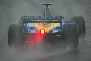 冠軍在望?!![]() ▲以往只規定亮起即可,去年起則規定車尾LED必須在Wet Race中閃動,開啟循跡控制系統者也必須遵照辦理,在雨霧中同時也有避免追撞事故的功能比賽進行到第一半時,部分跑道逐漸變乾,不過有太多前車之鑑,因此無人膽敢換成乾胎上場。此時的領先者仍是Coulthard,Raikkonen超前了R.Schumacher後繼續追擊前車,而“巴西希望”Barrichello更不斷以最快單圈時間對領先者施壓。幾圈後,Barrichello趁對手失誤跑開路線終於超前取得領先,全場觀眾歡呼陷入瘋狂狀態...