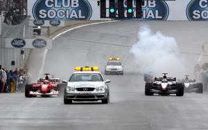 全場矚目的Rubinho![]() ▲巴西站中Maylander(SC駕駛)肯定大嘆錢難賺,不過M-BENZ則會相當高興CLK 55 AMG的露臉機率如此之高在巴西聖保羅當地時間四月六日下午舉辦的這場比賽,賽前連續幾天大雨已造成部分車手訴請賽會以安全理由取消週五的排位賽,不過所有賽程最後還是依照原定計劃進行。週六排位賽中取得竿位的是巴西籍的Rubens Barrichello,這位來自FERRARI車隊的車手雖然已經參賽十年,卻保有連續八年在Home GP無法完賽的紀錄,也因此取得PP之後使他的機會相當看好。