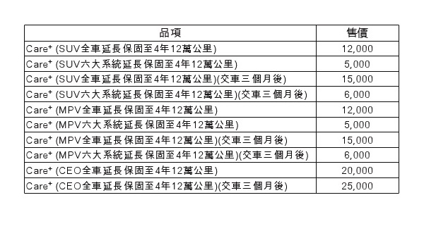 這項付費的方案依照車型的不同與保固範圍的差異也有差別。舉例來說如SUV或是MPV車型全車延長保固均是12000元,若只延保六大系統則為5000元(交車3月後為6000元)。而六大系統的保故範圍則有引擎控制電腦、引擎燃油系統、引擎冷卻系統、變速箱以及引擎本體等六部機件。