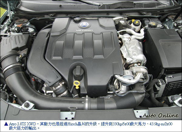 Aero 2.0T其實和Vector 2.0T是同一顆引擎,其運用了雙渦流Turbo、缸內直噴、進排氣可變氣門正時等SAAB最新的引擎科技,只不過Aero 2.0T再加上Hirsch晶片的加持,引擎動力就從原本的220hp/5300rpm最大馬力和35.7kg-m/2500rpm最大扭力,躍升至260hp/5200rpm的最大馬力和40.8kg-m/2500rpm的最大扭力,在未更動引擎下,這樣的動力提升可算是相當吸引人。