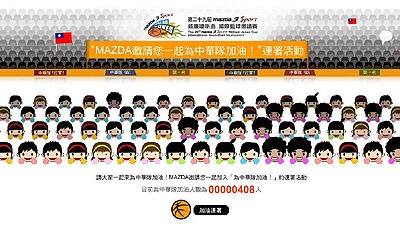 同時MAZDA Taiwan特別在官方網站上( http://www.mazda.com.tw/GoForTheWin/)發起「MAZDA邀您一起為中華隊加油」的網路連署活動,只要上網參加連署為中華隊加油的球迷們,就有機會可以得到中華隊球星獨家簽名籃球,期待球迷們以熱情響應為中華隊加油,將冠軍獎盃留台灣!
