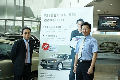 欣逢VOLVO 80週年慶,為延續VOLVO於「安全」的永久承諾,以及歡慶VOLVO於全球車壇貢獻之重要里程碑,台灣富豪汽車特別於6到8月底期間規劃一系列慶祝活動以回饋車主,於活動期間入主VOLVO全車系任一車款,即有機會坐擁薈萃VOLVO 80年榮耀頂級旗艦柴油房車S80 D5的絕佳良機。