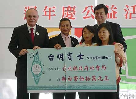 這次的週年慶活動,邀請到去年開幕活動中一同見證捐款儀式的台北縣長周錫瑋到場,一起參與台明賓士捐贈新台幣50萬元響應「臺北縣弱勢家庭圓夢計畫」及『愛心滿杯』公益活動。周縣長也回贈台明賓士陳宗仁董事長「臺北縣政府感謝牌」乙面,代表台北縣需要幫助的弱勢家庭表達無限的謝意,並積極呼籲更多的社會資源一起投入公益活動。