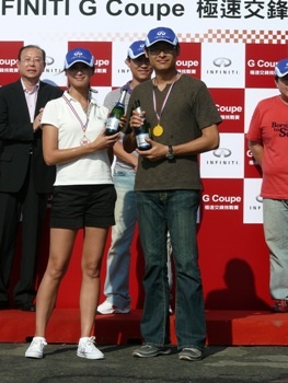 ▲未來車主組冠軍與名模組冠軍童怡禎高舉香檳慶祝INFINITI All New G Coupe搭載最新VQ37VHR引擎,加入V VEL連續可變汽門正時與揚程,迸發328hp最大馬力,紅線區高達7600轉,是一部高轉速高效能的新世代引擎。搭配日產獨創的四輪主動轉向科技,以電子控制系統整合前輪主動轉向與後輪最大1度偏向,在高速行駛時操駕更精準穩定。將如此高水準的跑車基因,披上日式簡約美學的誘人線條,內藏精緻貼心的車室鋪陳,一部近乎完美的雙門轎跑車由然而生,正以貼心的售價等待您的入主,享受更精彩的人生!