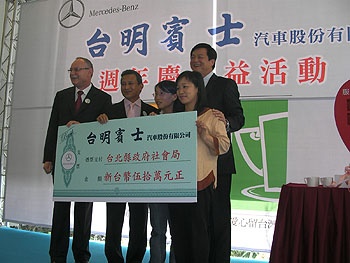 這次的週年慶活動,邀請到去年開幕活動中一前見證捐款儀式的台北縣長周錫瑋到場,一起參與台明賓士捐贈新台幣50萬元響應「臺北縣弱勢家庭圓夢計畫」及『愛心滿杯』公益活動。周縣長將回贈台明賓士陳宗仁董事長「臺北縣政府感謝牌」乙面,代表台北縣需要幫助的弱勢家庭表達無限的謝意,並積極呼籲更多的社會資源一起投入公益活動。