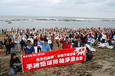 ![]() 活動自上午八點半開始,近千人陸續抵達淨灘現場。台北縣副縣長李鴻源、和泰汽車張重彥總經理及三芝鄉花村祥鄉長等共同主持「和豐灣」揭牌儀式後,全體淨灘人員以活力健康操暖身,隨即分組開始恢復沙灘清潔。淺水灣現場還舉辦親子沙雕及沙灘躲避球等趣味活動,讓參與淨灘環保活動的民眾,全家大小都在淨灘活動中,體驗寓教於樂的活動精神。