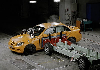 歐洲新車安全評鑑協會(EURO-NCAP)的撞擊測試結果證明了Mercedes-Benz基於實際道路事故所進行的無數次分析與研究,讓C-Class得以在全球公證機構所進行的撞擊測試中表現非凡。有了附束力限制器之後座自動束緊式安全帶、及主動式頭枕等標準配備的加持,C-Class轎車車型提供了乘員最高標準的安全保護。具有高剛性安全車體結構的C-Class,在車頭與車尾設有撞擊潰縮區域,同時全車有高達70%的鈑件採用高強度鋼材,另有20%如B柱區域採用全新研發的超強度熱模鋼材,這些鋼材的強度遠超過傳統鋼材的3到4倍,除了有效降低車重,並讓車體抗扭曲性較上一代提升13%,讓車體在面臨正面與側面撞擊時,將撞擊能量有效吸收及分散,使籠形車體不致於變形,提供乘員更安全的保障。