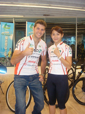 ![]() ▲法籍極限運動單車達人康博尚特地到現場為華萱加油打氣肩負【AMD綠活環島之旅】重責大任的AMD綠活大使魏華萱,在今天與熱情的車友們,從風雨中的台北出發展開環島之旅,而擅長冒險旅遊的康博尚也特別在出發前為華萱加油打氣,分享「大無畏」的精彩旅行經歷;而知名部落客工頭堅,則以獨特的見解,勉勵華萱勇敢追求屬於自己的旅行意義。