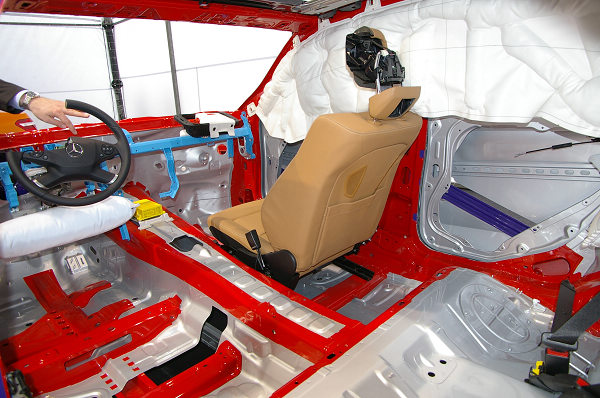 靜態展示方面,原廠特別運來符合EuroNCAP車頭偏位64km/h撞擊後的實車,以及去除車殼能清楚看到車體結構組成的展示車,用來說明賓士如何透過不同強度剛性的結構,營造多重潰縮的空間,來保護車廂內的乘客安全。除了法規要求的碰撞試驗,賓士廠內每年平均自行進行的碰撞試驗就超過500次,這種頻繁而大規模的碰撞試驗讓工程師設計出最佳防護車體結構,藉此達到最全面的被保護效果。
