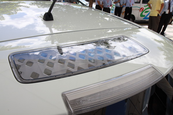 ![]() ▲Leaf的冷氣系統的電力由尾翼上的太陽能面板所提供Nissan Leaf的基本規格為4445x1770x1545mm,續航力約為120公里左右。Leaf特別的地方於它是Nissan集團一開始就為了電動車所特別開發的車型。國內很多業者的電動車許多都還是利用汽油動力車改裝而來。因此Leaf在外觀上的一大特徵就是位於車頭的充電裝置。