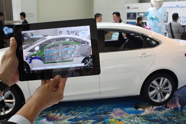![]() ▲AR賞車區AR賞車區:賞車最注重的莫過於眼見為憑,顧客不僅可親自觸摸、試坐、操作之外,LUXGEN更導入AR擴增實境(Augmented Reality)輔助消費者更加了解車輛,也就是以平板電腦對準實車進行拍攝,即會出現X光透視效果,絕妙地讓車體剛性結構、引擎動力設計在眼前360度翻轉觀賞,加上模擬安全氣囊的彈出位置等,讓顧客更全方位理解車輛特性。