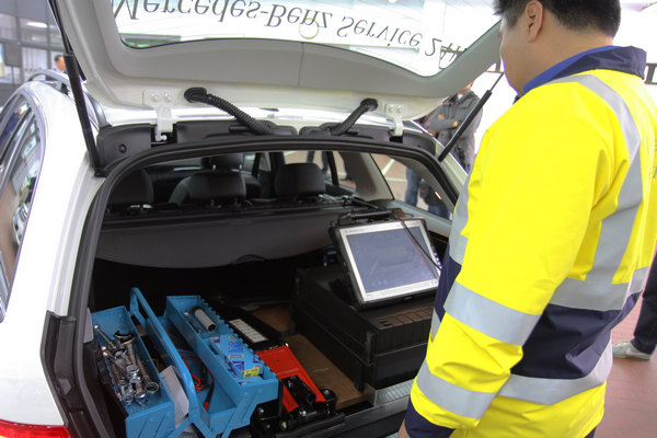 ![]() ▲按照德國標準,本應採用B-Class及C-Class Estate作為救援車輛,不過業者透露台灣的B-Class尚無法應付交車潮,因此直接採用後者作為救援車。在「救援識別」方面,除採用與德國原廠相同標準的黃色救援背心、夾克,使車主容易辨識服務人員,並於各種天候提高用路人警覺,以確保車主與救援人員安全無虞。而「救援車輛」和一般車商使用商用車不同的是,這次台灣賓士選擇的是M-BENZ C-Class Estate旅行車款,23輛救援車隊清一色都是採用白色塗裝,車身上也統一標示「Mercedes-Benz Service 24h」字樣,提供品牌一致性與清楚識別。至於「維修工具」的配備則來自德國原廠診斷電腦、頂級專業尊榮的急修行動工具組等。