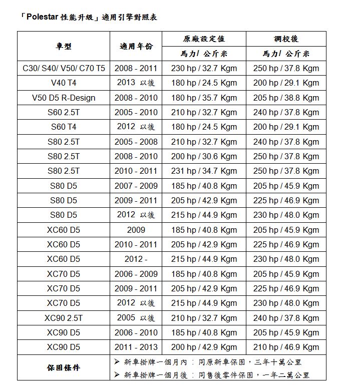 ![]() Polestar Racing自1996年起成為VOLVO征戰各大國際房車賽事的官方合作夥伴,對於VOLVO車系的外觀、動力、底盤…等的性能擁有相當豐富的調校經驗,因此Polestar團隊操刀的「Polestar性能升級」服務可以說是累積國際賽事經驗實現在市售車款的最佳展現。 ![]() ▲安裝「 Polestar 性能升級」服務 即可免費獲得台東山水軒渡假村雙人住宿券乙張和 VOLVO 服務禮券因為嚴格縝密的研發流程,所以「Polestar性能升級」服務具備VOLVO一向堅持的高品質,也因此VOLVO提供了新車安裝隨車三年十萬公里或售後安裝一年二萬公里原廠保固的保證,確保車主在提升駕馭樂趣之餘也可以安心無虞。 安裝「Polestar性能升級」服務 限量再享台東歐式渡假村住宿和VOLVO服務禮券 此次國際富豪汽車引進的「Polestar性能升級」服務,可針對VOLVO車系搭載的多具汽、柴油引擎進行動力升級服務,以S60 T4汽油引擎為例,透過軟體升級的調校後,最大馬力輸出增加20 hp、最大扭力增加4.6 Kgm,是超高C/P值的原廠性能升級服務。 國際富豪汽車為了感謝首批安裝「Polestar性能升級」服務的VOLVO車主,限量推出「愛車升級 玩樂成行」酬賓活動,6月1日起至7月15日止,前80位VOLVO車主只要回廠安裝「Polestar性能升級」服務,即可免費獲得總市價約NT$4,000元的台東山水軒渡假村雙人住宿券乙張和VOLVO服務禮券,讓車主享受優越性能的同時,更能與親愛的家人、朋友來趟愜意的後山之旅,活動詳情歡迎造訪VOLVO官網VolvoCars.com.tw或洽全國VOLVO授權服務中心。