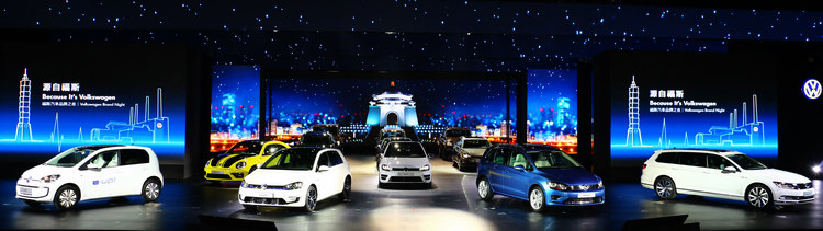![]() ▲台灣與來自德國的經營團隊共同宣示全新品牌形象注入台灣市場。晚會現場展演二十多款乘用及商用車型,也宣佈了車迷朋友最關心的新車上市計畫;現場並展示e-UP!電動車,與GTE Golf插電式油電車等兩款象徵福斯在動力科技的研發成果,同時還提前公開Sportsvan轎旅車、Passat大型房車,及發表Touareg小改款新車。