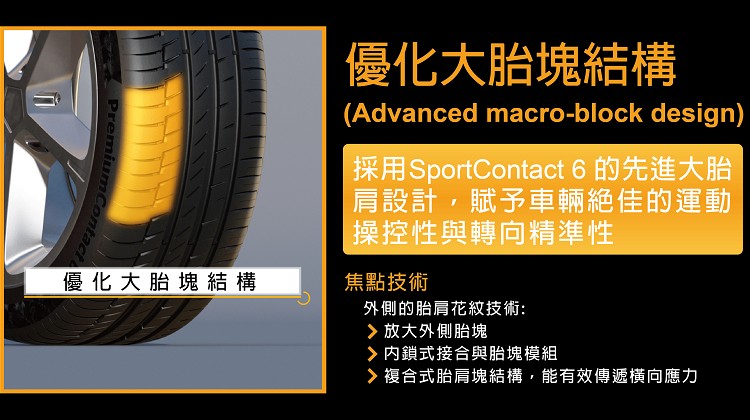 全新 PremiumContact 6 成功消弭運動操控與舒適乘駕的籓籬,讓操控性、舒適度、低滾動阻力與使用里程數,能於單一產品達成完美的均衡表現。PremiumContact 6歐洲原裝進口,產品結合ContiSportContact 5的運動操控與ContiPremiumContact 5 的均衡舒適,提供16-20吋等多款輪圈尺寸,適用於各式轎車與休旅車。