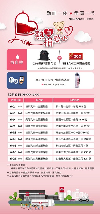 NISSAN為鼓勵車主踴躍參與「熱血捐愛心」活動,只要於活動現場捐血成功,即可獲得GT-R戰神運動背包或新台幣200元之NISSAN定保現金禮券,捐血人完成FB打卡活動更可獲得NISSAN運動冷水壺,裕隆日產誠摯歡迎全國車主及民眾,與NISSAN一起「熱血一袋、愛傳一代」。