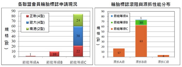 以國內輪胎銷售市場的現況來說,低滾動阻力、高濕地抓地力性能胎款的市佔比例已經成長至38%,但相對於已經施輪胎標示之國家相較仍有提升空間(例如歐盟50%;日本79%)。 歐洲、美洲、亞洲等各國陸續制定輪胎性能強制性能效標準及分級標示規範,限制不符合規範產品銷售及提供民眾產品選購資訊。讓消費者能夠更輕鬆地尋找到適合自己愛車的節能輪胎。 參考國外做法,國內也由能源局委託車輛中心於108年11月成立「節能輪胎產業聯盟」,建立輪胎自願性節能分級管理制度與相關推動事宜。節能分級管理制度的重要工作就是做出分級標示,揭露產品節能等級及其相關資訊,方便消費者作為選購參考,或許你會問,那為什麼輪胎不像車輛或家電一樣,直接由政府訂立分級制度與認定標準,而是要輪胎廠商自願性地去參與,申請非官方的認證呢?因為輪胎屬於被動性耗能產品,自己本身不消耗能量,政府自然無法直接去做分級管理。 節能輪胎產業聯盟所制定的節能分級區分為A、B、C等3個節能等級並以不同顏色明顯辨識;兼具現行「能源標章」之辨識明確及「能效標示」之效率等級之優點,明確引導消費者選購高效率產品。其中對各等級所訂定的節能/安全性能門檻,級距與國際一致,才能與國際接軌。