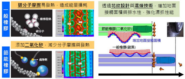 而節能輪胎透過胎紋最佳化、橡膠混煉技術及配方材料等設計優化,可兼顧輪胎磨耗性能表現(磨耗指數380~560)。經整車油耗測試,使用節能標誌輪胎相較於非節能輪胎,約可改善4~8%車輛燃油效率;在輪胎耐用里程不到一半即可還本(以行駛1.5萬公里/年、價差300元/條、油價25元/公升估算),所以買節能輪胎雖然價錢略貴些,但之後卻可以讓你賺回更多的油錢,其實是相當划算的。
