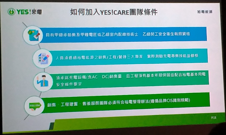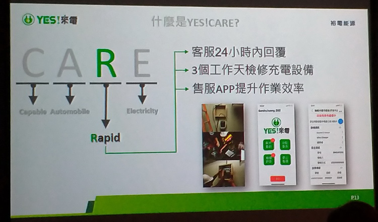 裕電能源 總經理高秀枝表示,裕電能源善用車廠背景,以「最懂電動車車主的營運商」自許,率先提出《YES!CARE》全心服務計劃,透過品牌完整的教育訓練與品質認證,確認合作夥伴施工標準與合理的施工費用,並要求通過認證的在地夥伴針對客戶的需求要做到24小時回覆、3個工作天檢修的服務準則。裕電能源攜手北中南第一批經銷商成為第一個充電營運商中關注電動車車主和場域業者售後服務需求的業者。