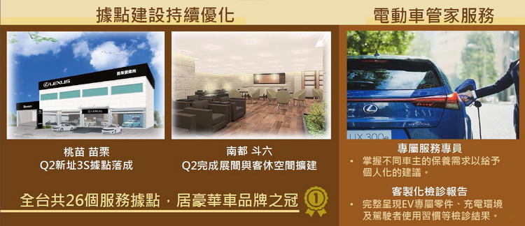 除了車款產品布局外,在服務面上,今年將擴大導入LEXUS LINK服務;對於電動車車主也將以電動車管家服務來給予車主更具個人化的服務;隨著LEXUS品牌在台25周年,和泰也將推出一系列的活動與回饋。