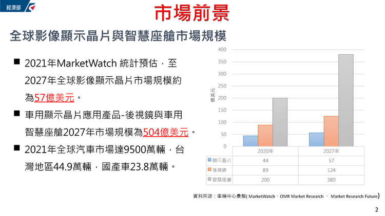 車用電子市場爆炸性成長 聯盟建立國內車用零件完整供應鏈![]() ▲在經濟部林全能次長(左5)見證下,車輛中心董事長黃隆洲(左6)與義隆電子董事長(左4)邀集友達光電、奇美車電、中華汽車、華德動能、成運汽車、創奕能源、大聯大品佳簽署MOU成立「車用AI影像晶片與智慧座艙顯示模組產業聯盟」據國際產調機構(MarkLines)資料顯示,未來電動車將佔所有公路運輸活動的8成以上。而順應著上述成長趨勢,台灣過去5年車用電子產業的產值,以每年13%的幅度快速增長,2021年將近台幣3,000億元,如今在ICT大廠陸續投入下,預期發展將更為快速,推估2025產值可望達到台幣6,000億元;MarketWatch統計也預估,至2027年全球影像顯示晶片市場規模約為57億美元,車用顯示晶片應用產品-後視鏡與車用智慧座艙的市場規模為504億美元,車用電子產值可望迎來爆炸性成長。