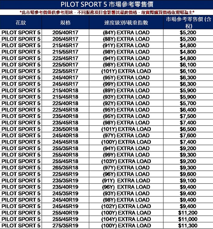 PILOT SPORT5源自賽道的技術精粹 街道使用的完美體現![]() 除了用於通勤,輪胎更是滿足多數車主操控樂趣的重要關鍵。多年來米其林將無數輝煌的賽道經驗帶入生活,並賦予PILOT SPORT系列兼具駕馭樂趣及日常使用。今日米其林宣布推出全新的PILOT SPORT 5,供熱血車主更優秀的使用體驗。目前供應主要尺寸為 17~20 吋,寬度從 205~275 mm、扁平比從 35~55。三項產品特色,讓車主能在各種情況下,輪胎都可以提供最高水準的演繹,PILOT SPORT5三大產品特色如下: