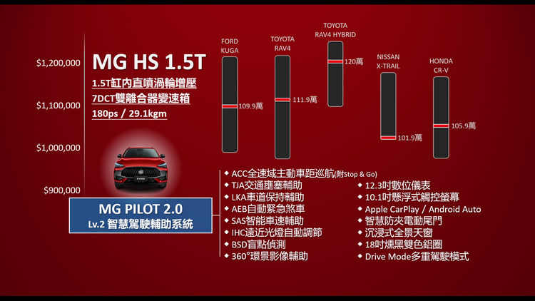 英國車壇百年MG品牌今日正式由總代理台灣英倫摩里斯(MG Taiwan)宣佈導入,MG Taiwan總經理陳宗裕除了對外闡述MG汽車的品牌經營理念、極具競爭力的產品規劃、完善的經銷體系佈局,以及結合線上與線下實體據點服務的新銷售模式之外,還首度展演MG在台第一款由中華汽車製造生產的全新力作 – HS 1.5T汽油渦輪與HS PHEV油電動力車型,表達MG品牌深耕台灣永續經營的企圖與決心。 MG HS重點規配表