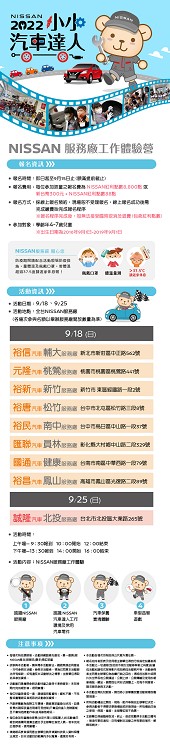 裕隆日產汽車因應COVID-19防疫政策鬆綁、消費市場回溫,為持續推廣兒童汽車知識體驗活動,以及回饋廣大NISSAN車主的支持,特別於9月18日及9月25日分別在全台9家NISSAN服務廠,舉辦2022「NISSAN 小小汽車達人」服務廠工作體驗營活動,全台共計300個名額,車主自9月12日起至9月15日止可於NISSAN官網線上報名。