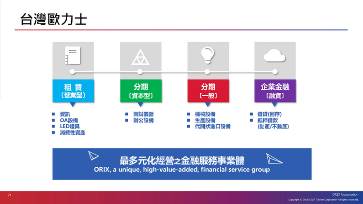 ![]() • 台灣歐力士提供企業全方位整合性金融服務