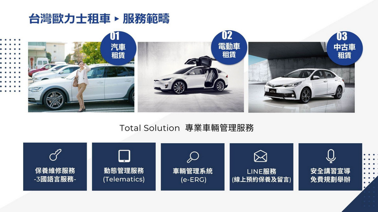 歐力士租車在企業長租及個人長租的租賃方案皆能滿足各族群的用車需求,以企業長租為例,負責的租賃顧問會提供最適切的企業節稅方案、全方位保險規劃及車隊管理系統,依公司需求量身規劃最合適的租賃方式,任何品牌任何車款皆可承租,彈性靈活、申辦流程簡易,無論是商務代步或公務用車,都是企業最明智的選擇。