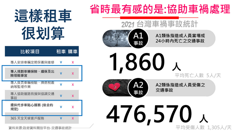 選擇歐力士租車的好處在於無須一次支付大筆現金,若以公司租賃還能簡化財會稅務作業、月租金全數可作費用扣抵、5% 營業稅可扣抵當月銷項稅額、無須受限車輛列固定資產之折舊耐用年限及 250 萬上限之規定、無車輛出售跌價損失之疑慮。 對比傳統購車流程在省時方面,歐力士租車會以專人服務的方式安排車輛定期保養與維修、保險及出險理賠事宜、車輛檢驗及牌燃稅繳納等監理作業、道路救援與協助交通事故、提供代步車服務(依合約規定)、365 天全天候客戶服務,以最用心快速的方式符合客戶的期待。