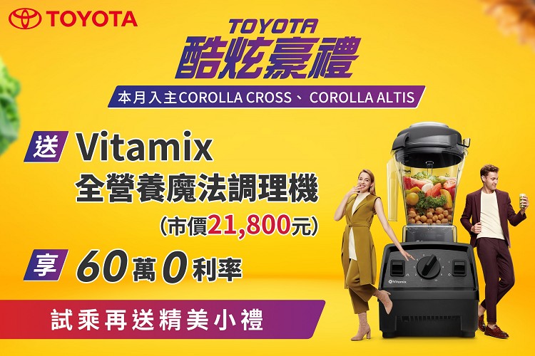 為感謝消費者長久以來的愛護與支持,和泰汽車元月份將延續「TOYOTA 酷炫豪禮」限時優惠活動:本月入主COROLLA CROSS、COROLLA ALTIS,就送美國百年精品品牌Vitamix「全營養魔法調理機」(型號E310,市價21,800元),希望讓顧客在新的一年開新車、迎接美好新氣象的同時,也能輕鬆百變各式美食。本次活動除贈送「Vitamix全營養魔法調理機」外,消費者亦可享60萬高額0利率優惠,入主就趁現在。迎接新年,買台新車好過年,用豐富好禮展開酷炫生活吧!詳細優惠活動資訊請至TOYOTA官網:https://www.toyota.com.tw/,或洽詢TOYOTA全台展示中心。