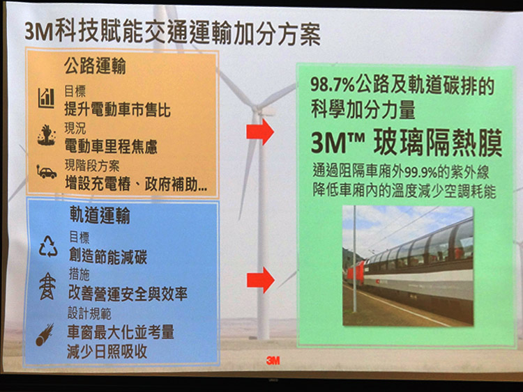 ▲3M透過玻璃隔熱膜,讓大開窗的大眾運輸工具避免過度使用冷氣,影響續航里程,或是降低對於電力的依賴。