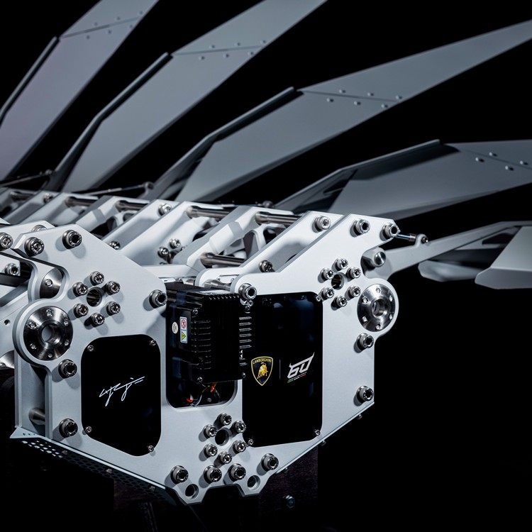 12對機械羽翼對應品牌指標性的V12引擎,當羽翼節奏性的舞動時即象徵著Lamborghini超跑加速以及動態性能,同時代表自1963年起,品牌不斷演進,創造出技術與性能的獨特指標。