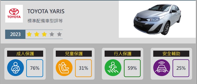 已停產的Yaris僅拿下三顆星在這梯測試中另一個車款TOYOTA YARIS 於四大安全領域得分率中分別獲得成人保護 76%、兒童保護 31%、行人保護 59%及安全輔助 25%,依據星級評等平衡標準規定,YARIS 車型整體星級評等為三顆星。