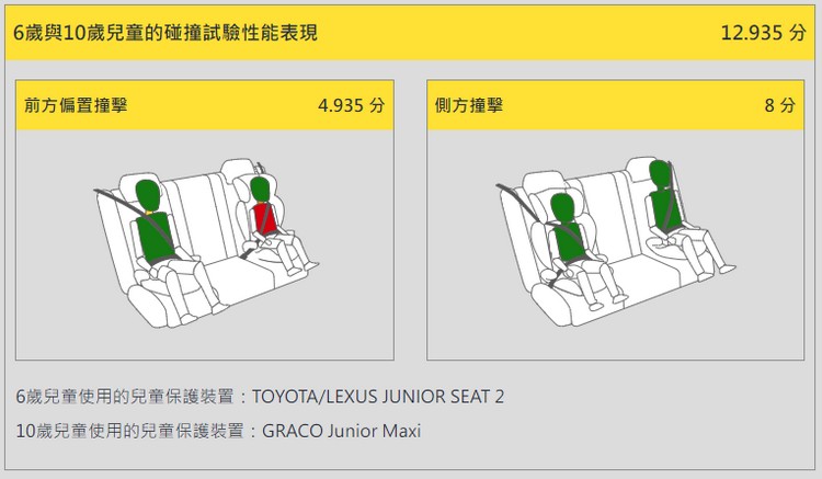 而在對6歲與10歲兒童的碰撞性能表現,不管是前方偏置撞擊與側方撞擊試驗,也多半獲得「優良」與「良好」的保護評價。且可正常安裝通用型、ISOFIX與i-Size的兒童保護裝置。另車輛於第二排左側及右側具有可安裝i-Size兒童保護裝置的功能且均有i-Size標識,並可容納較大型後向兒童保護裝置。