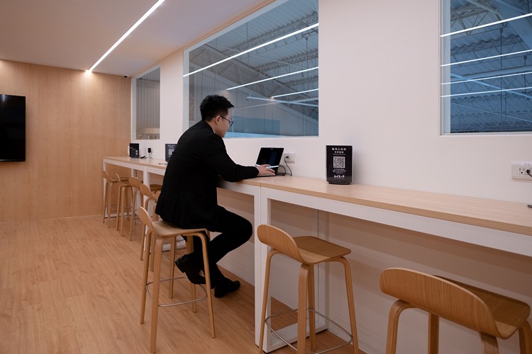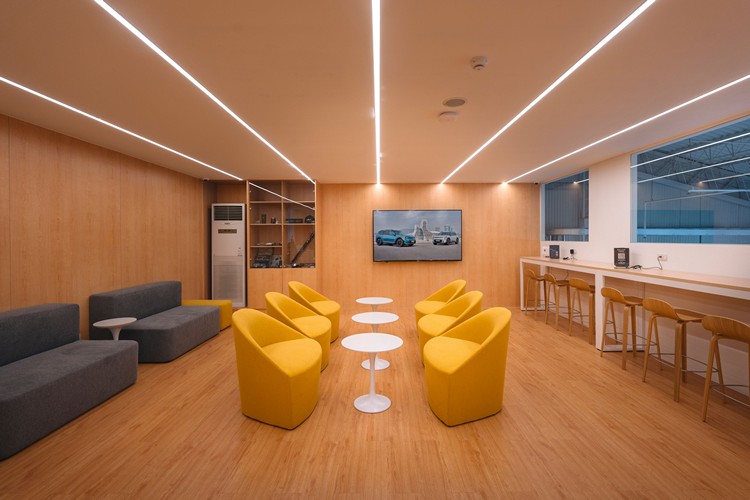 客休區除了設有沙發、吧檯式座椅等供休憩外,還提供3C充電設施、75吋大型電視等設備,讓回廠的車主在等待愛車維修的同時,能有舒適且自在的休憩空間。