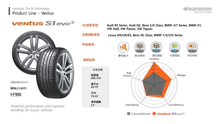 韓泰輪胎的Ventus S1 evo3,是專為豪華汽車打造,擁有卓越性能與操控,讓駕駛在操控上能感受輪胎的抓地力,以及在濕地操駕的安全性,並且有降噪功能,在行車間能達到安靜與舒適。