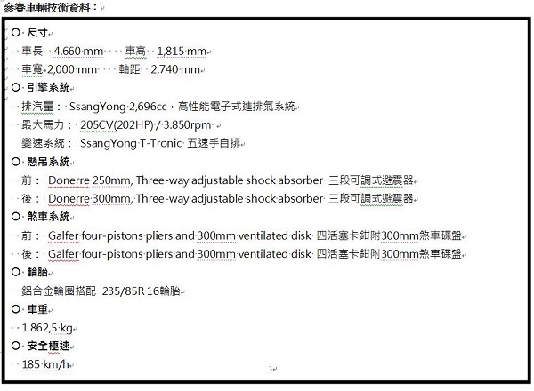 ![]() 艱難的賽程,除了嚴格考驗正副駕駛越野駕車技巧、經驗和默契外,賽前的車輛改裝、整備及人員訓練,更是SsangYong Kyron車隊能夠完賽的關鍵。依照FIA國際汽車聯盟〈Fèdèration Internationale de I’Automobile〉針對四輪傳動參賽車訂定的標準,並符合達卡拉力賽的大會規定,西班牙雙龍汽車必須小心翼翼的拆解Kyron M270,並且在底盤、車架與車身上進行結構強化,諸如懸吊系統支臂,以及全車各處鈑件、橫樑、側樑、中柱及車頂等結構支撐點,皆必須進行強化,部分零組件則改採碳纖維材質,一方面順應車體結構改裝後的車形變化,一方面則使車身輕量化。