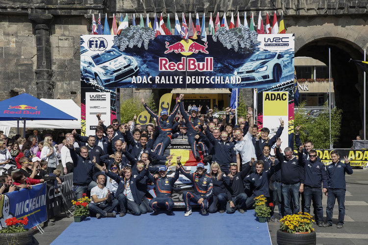 在正式重回WRC才第九場比賽,HYUNDAI車隊的車手Thierry Neuville就取得首場分站冠軍,同時他的隊友Dani Sordo也拿下第二名。HYUNDAI WRC總部位於德國,距離比賽地點只有225km,本次車隊成軍才短短一年半就能拿到首場勝利,除了顯示今年的實力相當堅強,更是HYUNDA賽車歷史中的全新里程碑。