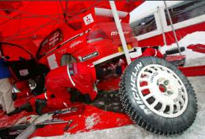![]() ▲雪地賽車胎不僅胎面窄,加上鋼釘應付冰滑路面也是必備措施,選錯輪胎可能就會非常悽慘第二天又是PEUGEOT賽車獨領風騷,Marcus Gronholm和Harri Rovanpera在這天盡量趕路,將第三名的Carlos Sainz遠遠拋開一分半鐘,領先者Marcus Gronholm則是儲存了50秒的安全領先距離。大雪不停地下的結果,幾位知名車手紛紛出狀況;Colin McRae比賽中撞上路肩後輪胎損毀,修復的時間足以讓他掉到十名外,要拿到積分的唯一機會就只剩下最後一天了。HYUNDAI的賽車在此原本表現相當不錯,可惜這一天賽程中Juha Kankkunen和Armin Schwarz雙雙因為傳動系統故障而減緩腳步,而沒有發生問題的Freddy Loix則是暫時保住第四名。SKODA的Kenneth Eriksson在這一天也有所斬獲,在改變了中差設定後成績突飛猛進,總排名一舉挺進到了第六名,不過他的隊友Toni Gardemeister則是翻車退賽。而SUBARU廠隊唯一倖存的Petter Solberg,則是因為引擎只剩下兩缸點火,並且在機油漏光的情況下退出比賽。