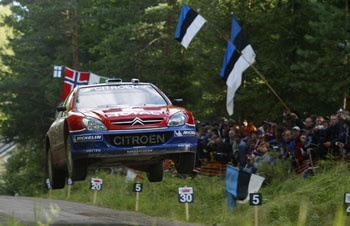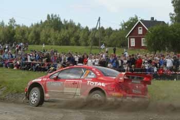 ![]() Gronholm回到故鄉後果然不負眾望,第一天就以5秒的差距暫時取得領先,然而他與第二名Loeb的副駕駛都在SS5著名的大跳台落地時受傷,在暫時沒有領航員的指引下Gronholm自己跑了一段路,只慢了1.8秒!在這兩位之後的第三名有點爆冷門,竟是PEUGEOT的Martin,這次他不再因車輛設定所苦,看來似乎307WRC在這種路面上相當吃香,不過Gardemeister與Solberg人都只距離他不到5秒,仍是不能鬆懈。