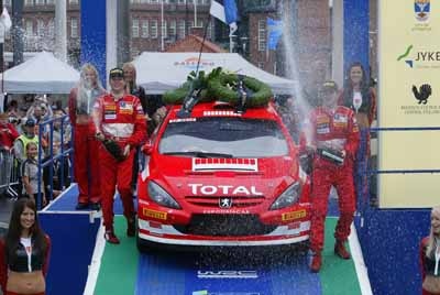 ![]() 在最後一天的比賽中,Gronholm順利摘下冠軍!也終結了Loeb的六連勝,第五度榮登芬蘭拉力王!Loeb自加入WRC之後的每一年都在芬蘭和他搶冠軍,今年還是敗下陣來,但積分榜上他早已倒贏Gronholm有30分了。Martin沒有讓Solberg奪走季軍,但最值得他高興的應是307WRC讓他開起來有信心,PEUGEOT也以1分之差重回車隊積分榜領先。