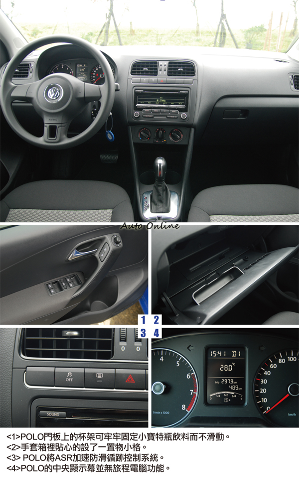 德國車向來注重人的安全,無論是車室乘員或是路旁的行人,因此在車輛上配置了諸多的安全配備。在被動安全上,雙前座SRS氣囊、雙前座頭枕頸部保護裝置、等等一般會有的被動安全配備POLO也都配置著,但僅有兩只SRS氣囊的配置,卻是讓我感到意外的。