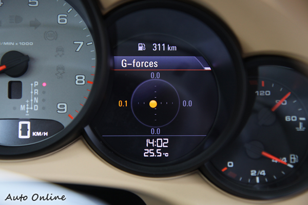 ▲轉速錶右方的多功能螢幕顯示器功能強大,除了可以顯示車輛狀態外,還有即時的四向G值顯示。