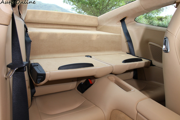 ▲老實說後座要坐進成人有點困難,當後座椅背傾倒之後,可以放置整組的高爾夫球具。