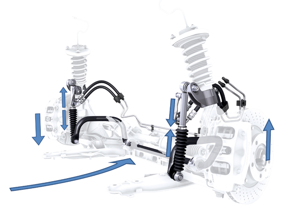 ▲PDCC主動式防傾穩定系統,透過防傾桿與車身連接的四個液壓缸來取代原本的轉接座,在車身遇到側傾時,透過液壓缸的調整可以抵消高速彎時的側傾,液壓缸最大調整範圍高達70mm,足以完全抑制過彎時G力大來車身的側傾範圍,有助於991在高速彎保有更好的加速性。